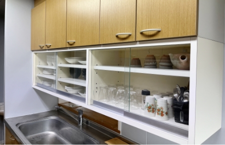 閑静な住宅街にあり、近隣にはコンビニ、スタバ、ショッピングモールなどお店も充実。寮の斜め前にはコミュニティーバスのバス停もあります。共同で使える食堂には、システムキッチンや冷蔵庫、調理器具や食器なども揃っています。自炊派には嬉しい施設です。